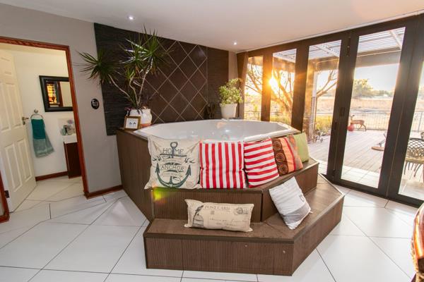 Outside, the living experience continues with a beautifully designed covered veranda that includes a built-in braai, bar area, jacuzzi, and a louvre roof system for year-round enjoyment. This space overlooks a sparkling pool and lush greenery, where you can unwind while enjoying the tranquil views and occasional visits from local wildlife.