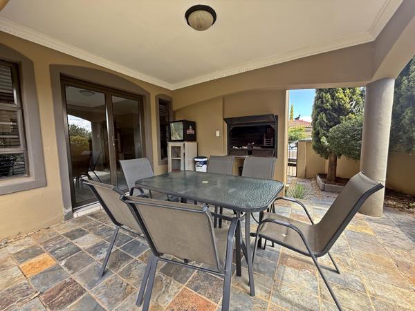The home features an open-plan layout with a stylish kitchen and scullery, seamlessly flowing into the dining and lounge areas. A covered patio with a built-in braai extends the living space outdoors, ideal for entertaining.