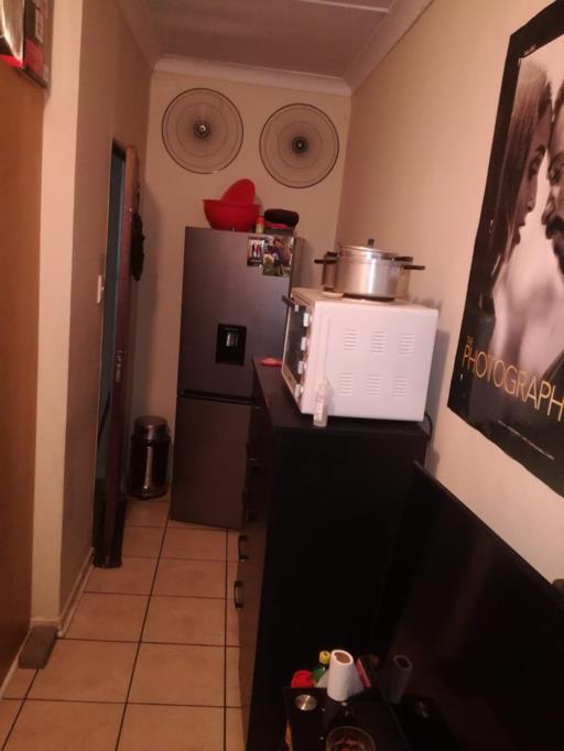 It is well taken care of and tiles on the floor. Both bedrooms are tiled out and the kitchen, passage and bathroom is half wall tiled.