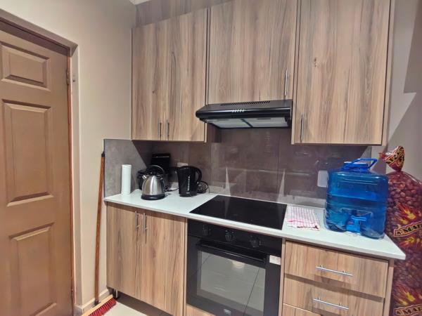 The kitchen is designed with built-in cupboards, providing ample storage and a functional workspace for all your culinary adventures.