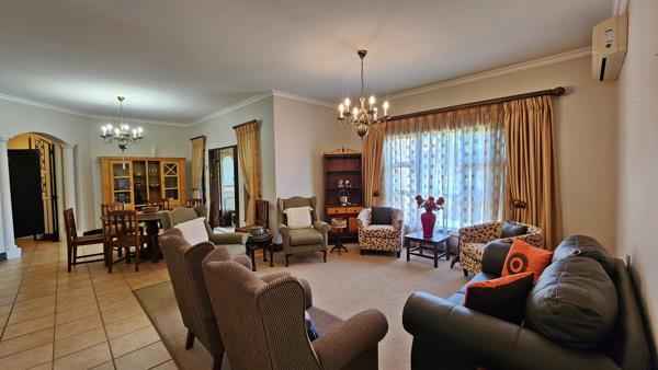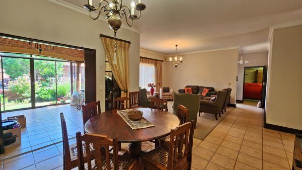 The spacious dining room forms the heart of the home, flowing to one side into a separate, inviting lounge area, and stepping to the other side into a charming enclosed stoep area.