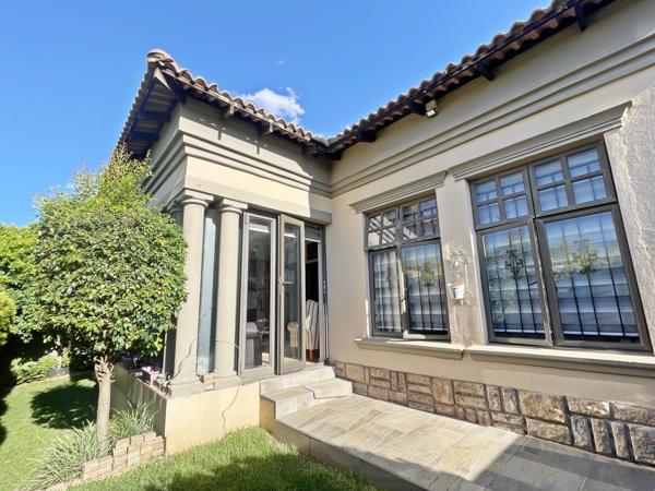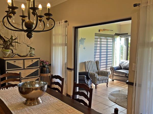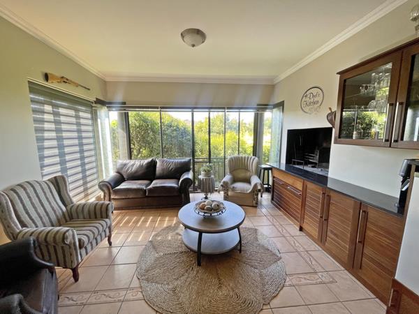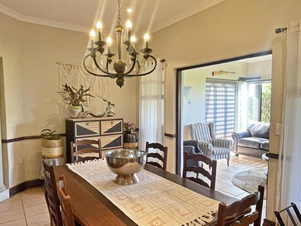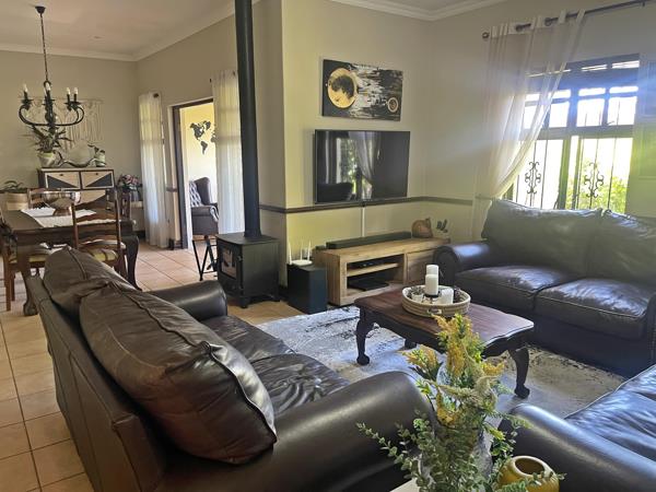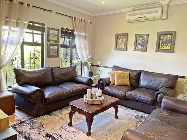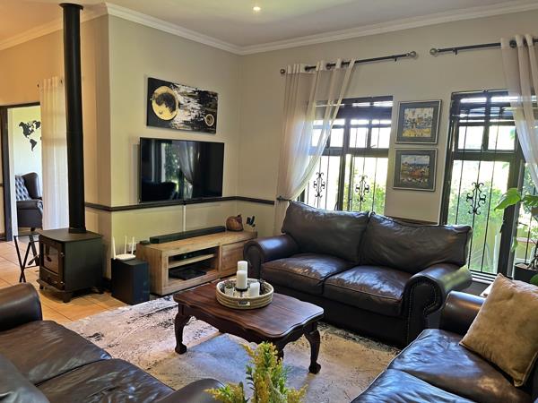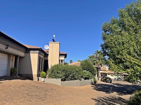 An enclosed patio with a built-in braai opens onto a beautifully landscaped private garden, perfect for relaxed outdoor living. A double automated garage, fitted with additional built-in cupboards and offering direct access to the house, ensures convenience and secure parking.