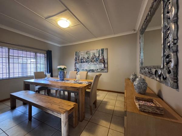 Outside, the property offers a double garage, four carports, a nanny room with its own bathroom consisting of a shower, toilet and basin, as well as a Wendy house for additional storage. The garden is complemented by a swimming pool and a Borehole with a 2000 litre JoJo tank.