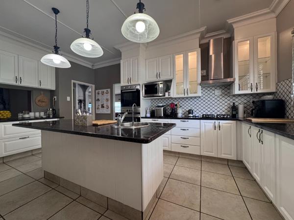 The kitchen is well equipped with a centre island, granite tops, a double oven, gas hob with extractor fan, and a dishwasher connection. A separate scullery and laundry add to the practicality of the home.