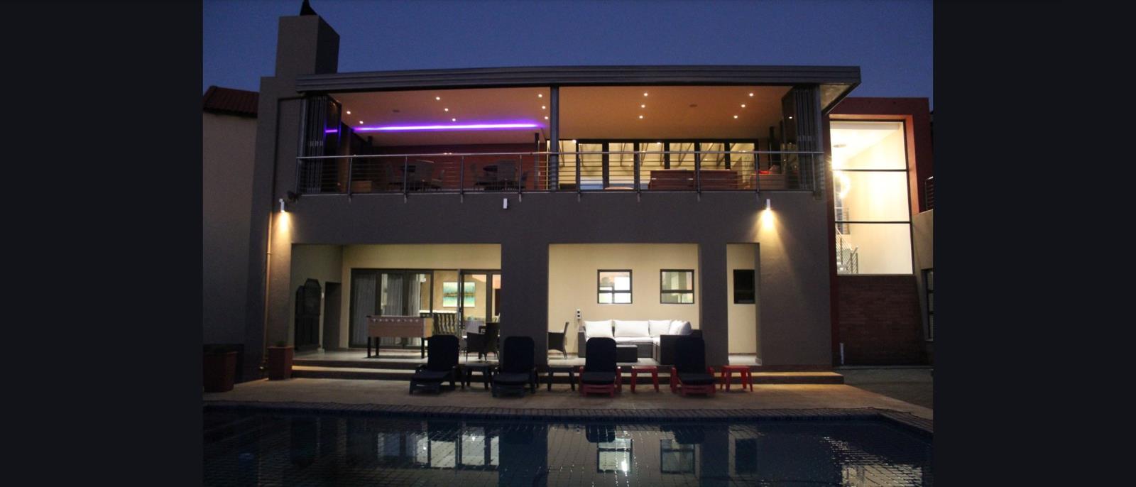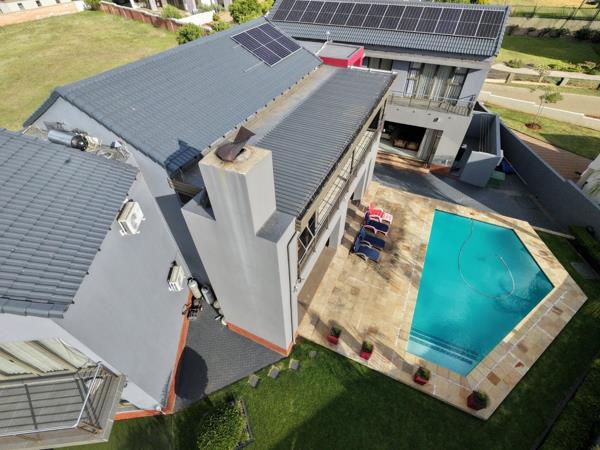 Meticulously designed backyard with pool, shaded patio, built-in braai, jungle gym, and laundry courtyard.
