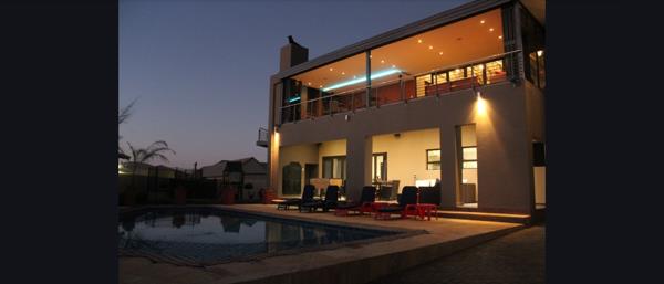 Covered veranda overlooking the sparkling pool, with built-in braai facility.