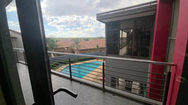 Master suite with private study, abundant built-in cupboards, en-suite bathroom Jacuzzi, his-and-hers showers, and balcony with estate views.