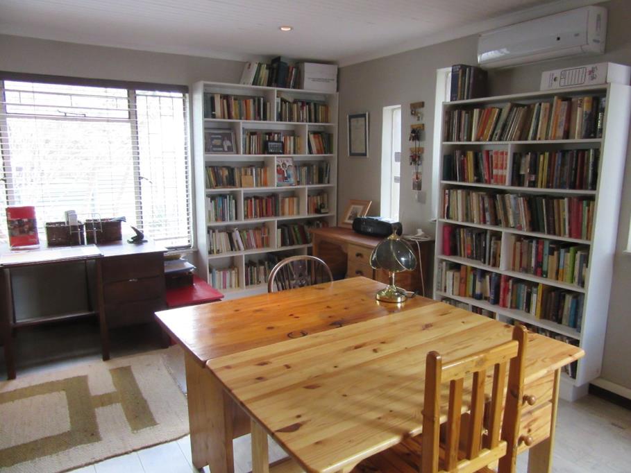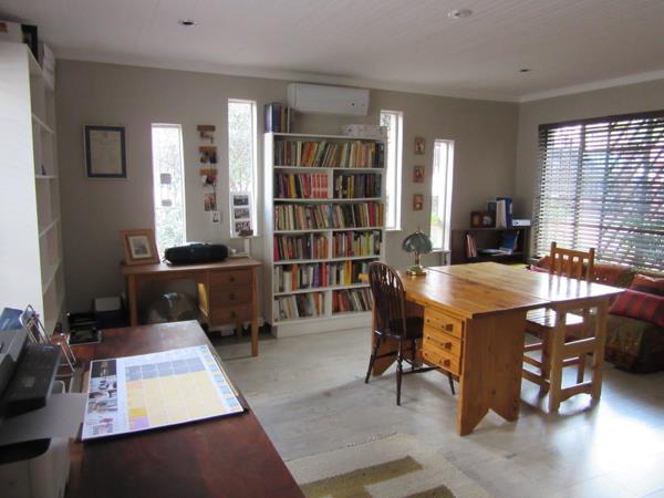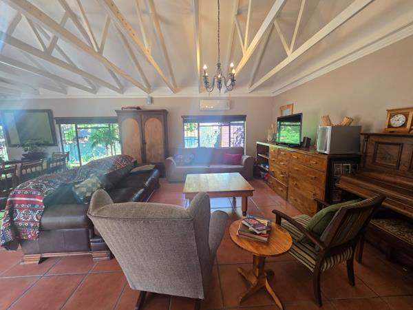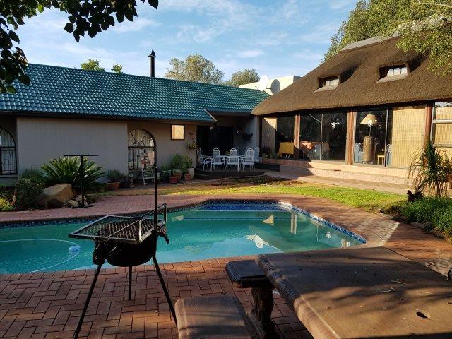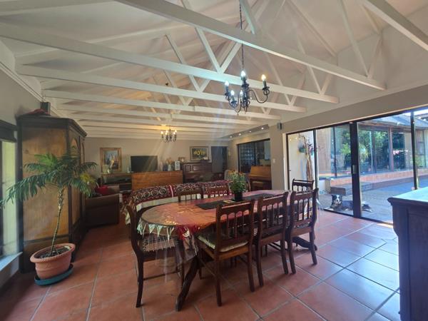This lovely home offers an open plan flow and modern high ceilings with exposed beams and chandeliers. The large Lapa, braai bar with sliding doors, flows through to the garden with a swimming pool, entertainers dream. You will find a large modern study at the entrance of the home and the 3 bedrooms has a view of the spacious garden and pool. The bedrooms and livingdining has air-con''s. Two modern full bathrooms of which one is en suite.
