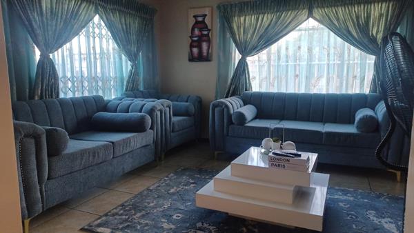 This stunning modern 3-bedroom house boasts a sleek and sophisticated design, perfect for familes and professionals. The open-plan living area features a spacious lounge, dining area, and a kitchen with island countertops and appliances.