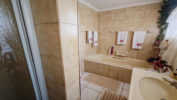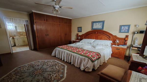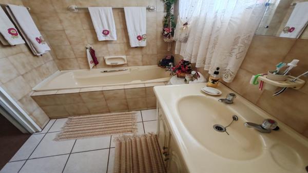The property features four bedrooms, all fitted with built-in cupboards. The main bedroom includes a full en-suite bathroom with a bath, shower, toilet, and basin. The remaining three bedrooms are serviced by a second bathroom comprising a bath, toilet, and basin.