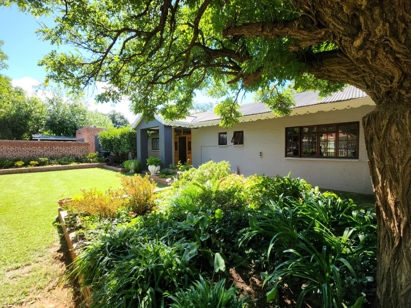 The property is set within a manicured garden, offering a tranquil outdoor escape with established greenery.