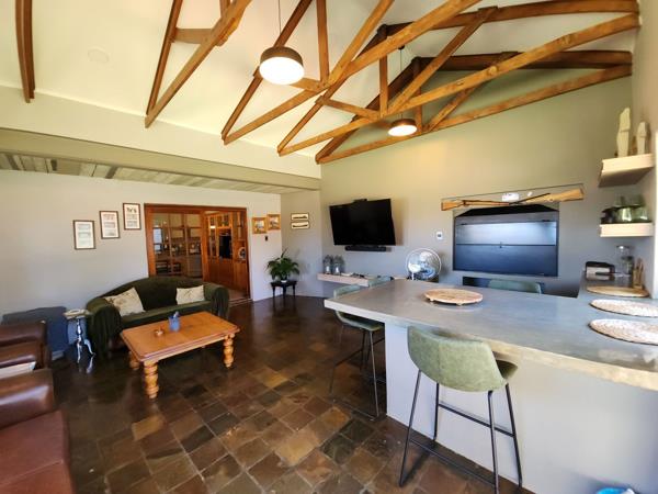 The heart of the home is the open-plan living area, defined by some striking exposed timber trusses. High-gloss parquet flooring and contemporary slate tiling provide a timeless yet modern atmosphere.