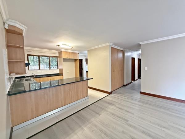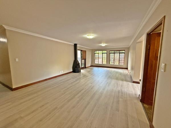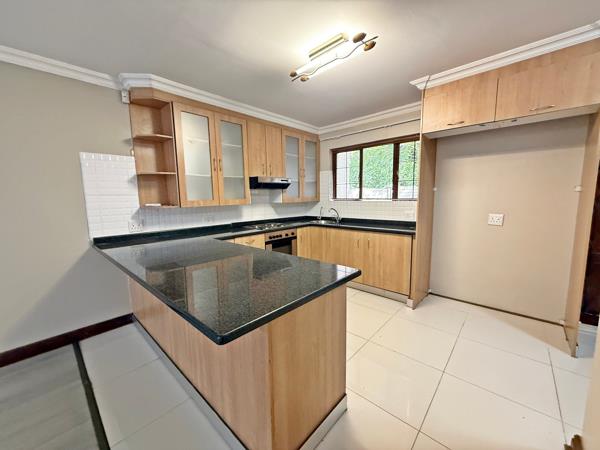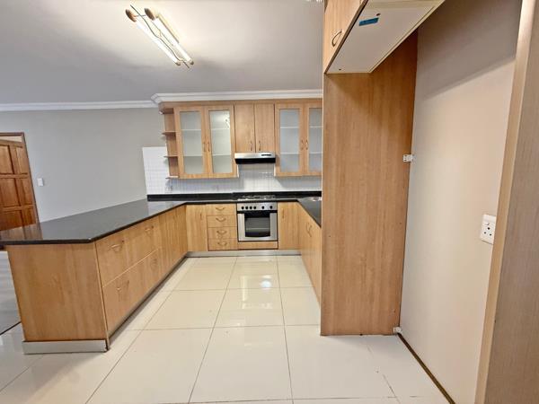 The home welcomes you with a spacious open-plan lounge and dining area, perfect for both everyday living and entertaining. The kitchen is beautifully fitted with built-in cupboards, granite countertops, a stove and oven, plus a separate scullery for added convenience.