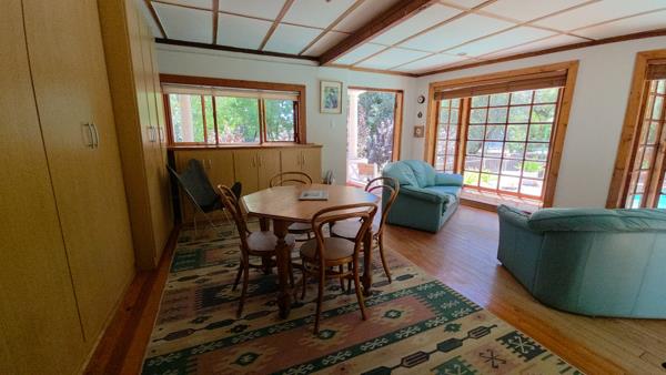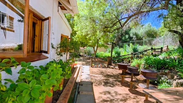 Inside, a cozy TV lounge with a fireplace and high steel ceilings flows into the dining room with large garden-facing windows and a second fireplace. The kitchen, generous and full of character, features granite countertops, ample cupboards, and a built-in grill. Be hind the kitchen there is a cobbled courtyard the perfect outdoor setting for meals or casual drinks, evoking a Greek trattoria. This is between the kitchen and laundry. Up a few stairs you get the laundry with a seperate shower, basin and toilet. In the same outbuilding you get and outside room with an ensuite shower, basin and toilet.