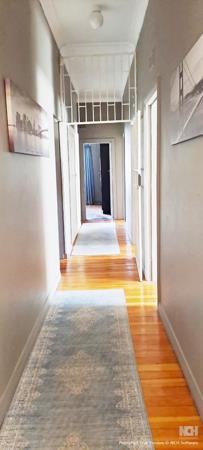 The kitchen is well-equipped with ample cupboard space, generous working surfaces, and fitted blinds. A separate scullery offers convenient fittings for both a dishwasher and washing machine. The passageway includes a large linen cupboard, providing additional storage solutions.