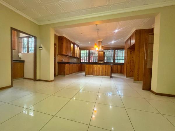 The generous dining area flows effortlessly into a well-appointed kitchen, featuring a gas stove, ample cupboard space, and a separate scullery for added practicality.