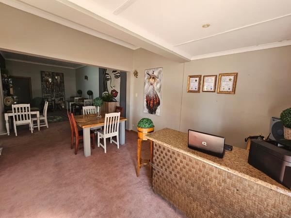 A reception area, lounge and 14 seater dining room. 3 Spacious bedrooms, all en-suite bathrooms. 2 Bedrooms opens up to a stoep and lovely garden. A specific area is currently being used by a nail technician. The kitchen with pantry is expansive. The 4 bachelor units are currently rented on a month to month basis. In the back yard there is a Duplex 1 bedroom flat with a wooden deck. The covered entertainment area is very convenient..