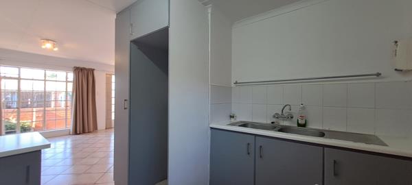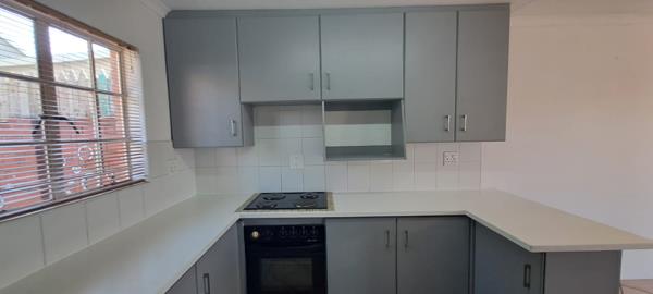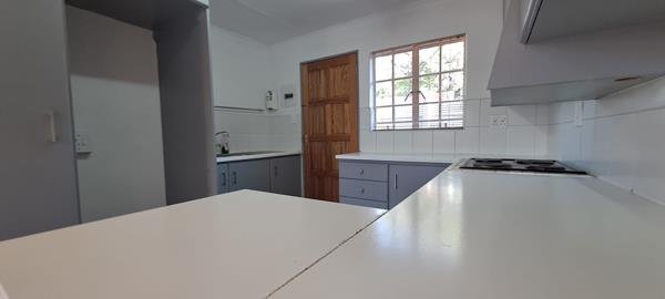 The kitchen offers an undercounter stove and hob, with ample cupboard space.