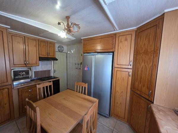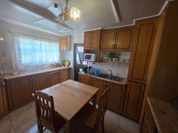 The kitchen is offering plenty of built-in cupboards, stove, hob and extractor unit.