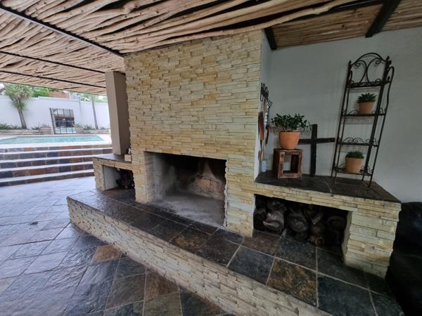 This stylish property welcomes you to a reception area. The private lounge area offers a gas fireplace and offers a door leading to a balcony, The dining room is spacious and semi open plan with the kitchen. The kitchen is very modern and spacious and offers a separate scullery area. The kitchen also offers a gas hob, electric hob, oven and extractor fans. The breakfast nook area is rounding the kitchen off. The tv room is very spacious and offers neat laminated flooring. This tv room can be turned into the cinema from home with a projector and screen. This tv room leads to the ultimate entertainment area that offers a built in braai - this area also leads to the sparkling swimming pool and neat garden. The separate section to this open plan tv room and kitchen area is the section that offers built in desks etc that can be used for hobbies, studying or office.