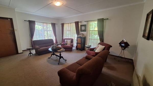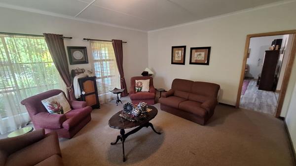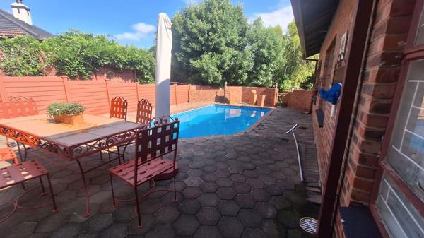 The formal lounge opens up into a large living area with a TV room and dining room. This room gives access to an enclosed braai area which open up onto the pool area, with a heated swimming pool.