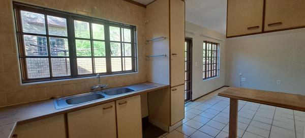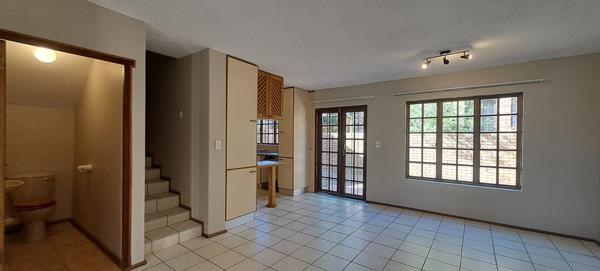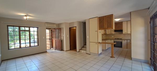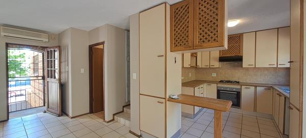 Downstairs - Open plan living area with an air conditioner, kitchen with ample cupboard space, gas hob, undercounter oven and extractor fan