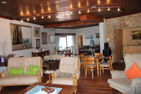 Grab this opportunity to earn an excellent income while staying in a sought after neighbourhood with a stunning view. This guesthouse doesnt need to advertise and is very popular. It overlooks the Pretorius Kloof game park and the Maluti mountains and has a peaceful atmosphere. This property is built on two levels. On top level are two bedrooms (one en-suite) in the house and a lovely big lounge with a fireplace and wooden floors where the guests enjoy their breakfast in the morning. On the same level are 3 more bedrooms, each with a sliding door that leads to the balcony, all en-suite with their own kitchenette and TV. The balcony leads to the deck with stunning views.