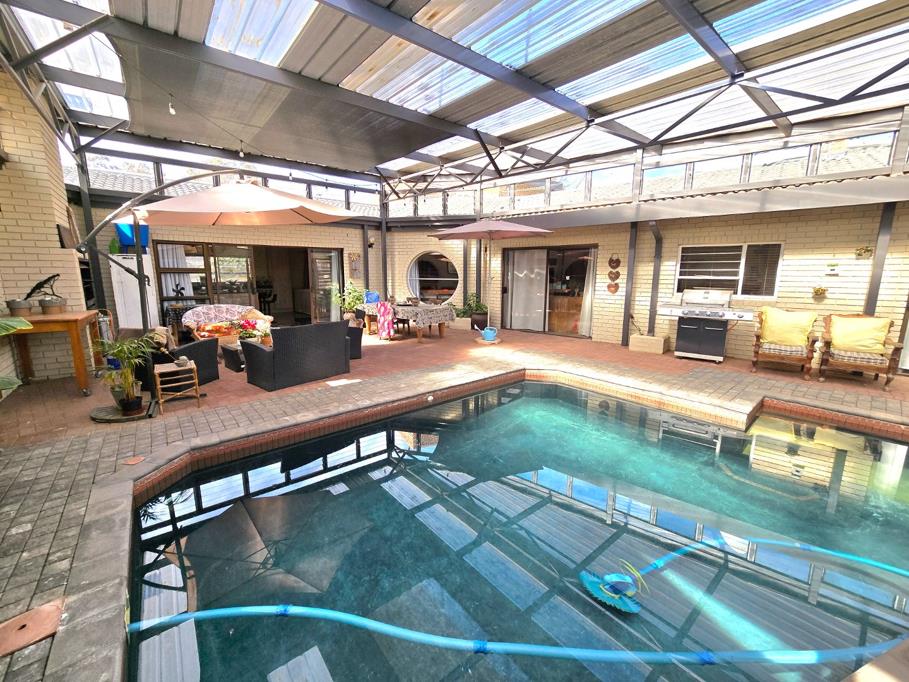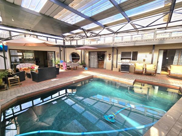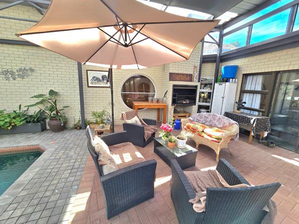 The magnificent entertainment area is very sunny and offers a stunning salt swimming pool and built in braai, this area is the heart of the house and offers easy access through sliding doors.