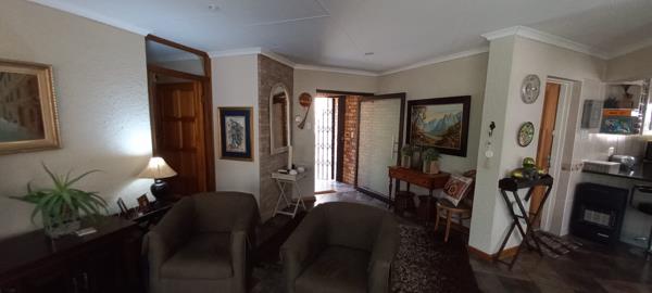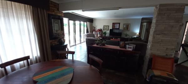 The tv room, dining room and kitchen area is open plan and offers neat tile flooring,