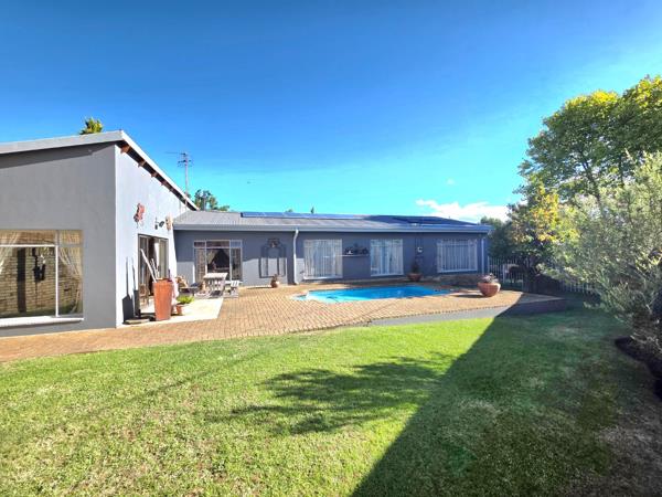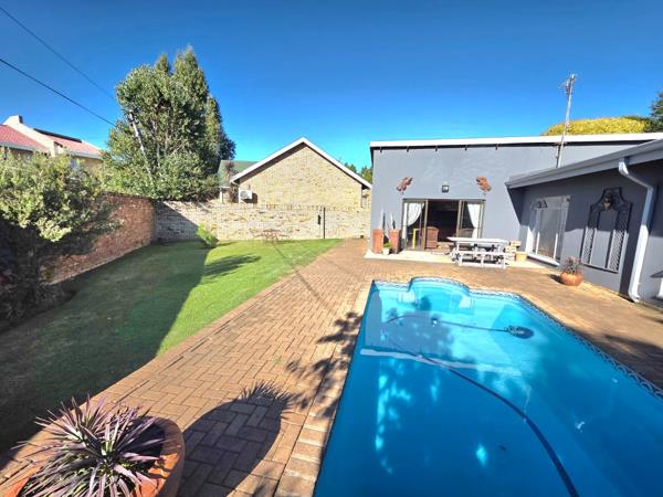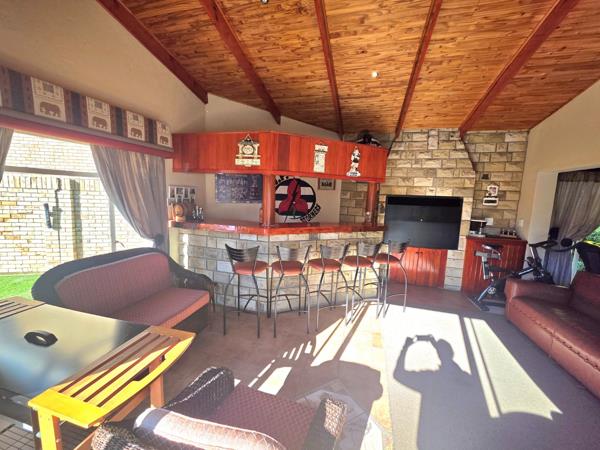 The braai room is a standout feature of the home, boasting high-volume ceilings, a built-in braai and built-in bar, making it the ideal entertainment area. Sliding access leads directly to the neat swimming pool with paved surroundings, perfect for relaxed summer gatherings.