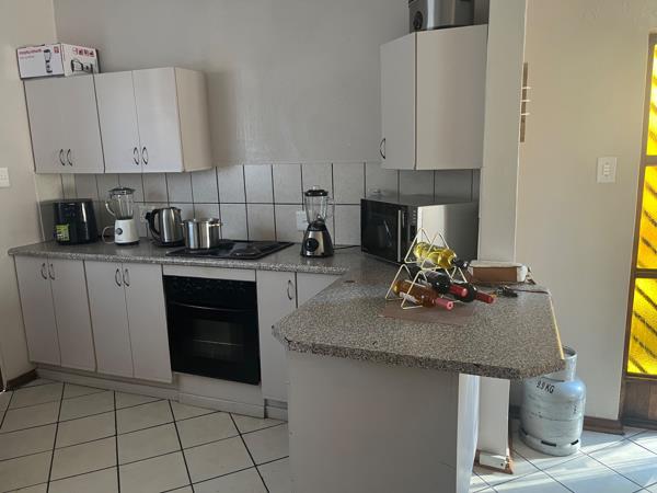 The living area is open plan with the kitchen that offers ample cupboard space, and a washing machine connection.