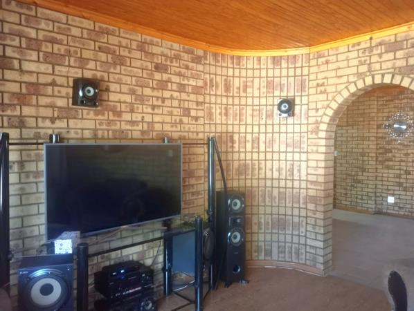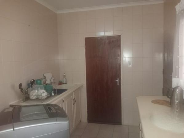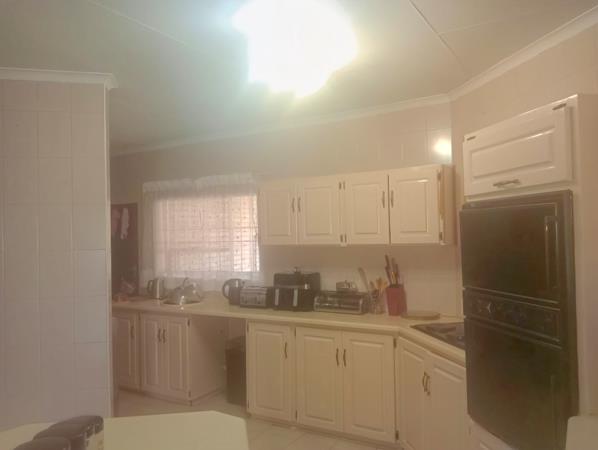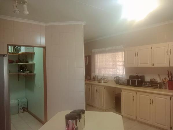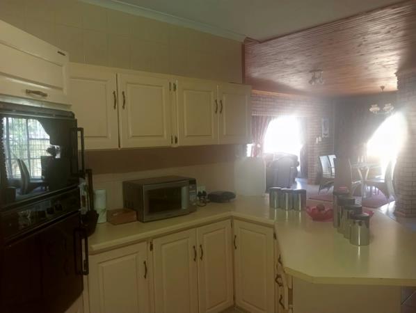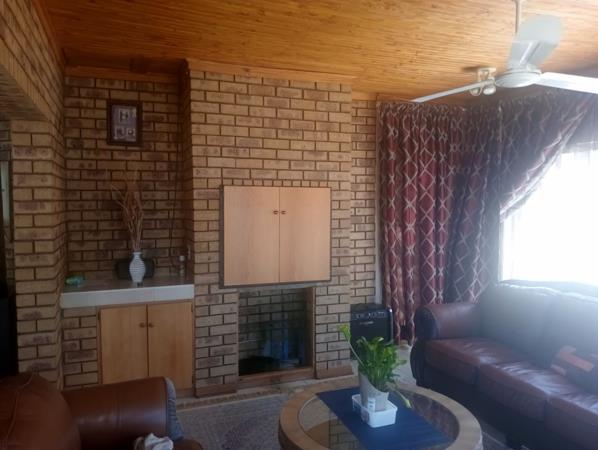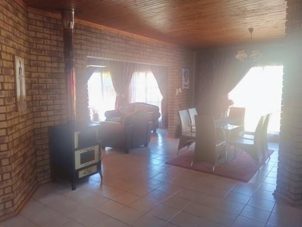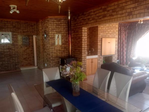 The master bedroom has a full-on suite bathroom. The entire living area is fully tiled and the spacious kitchen is open plan with a double oven and hob and a separate scullery with washing machine fittings and space. The kitchen also has a walk-in pantry. The living areas consist of an open-plan TV lounge with a built-in braai next to the dining room, a formal lounge, and a very spacious entrance space equipped with a slow-combustion stove which is useful in winter periods to warm up the entire living space.