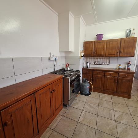 The inviting living room boasts high sloping ceilings and a large fireplace, perfect for cozy evenings. Double doors open to the backyard, where a lovely stoep offers the ideal spot for outdoor entertaining.