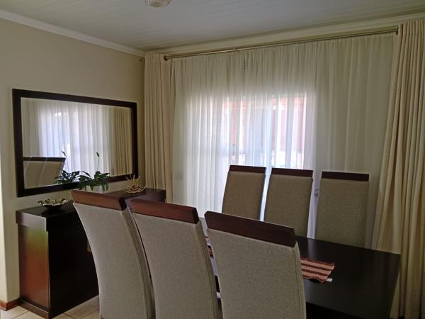 The welcoming lounge and dining area create a warm and inviting atmosphere, flowing seamlessly into a well-sized kitchen. The kitchen features ample cupboard space and includes a separate scullery, adding convenience and extra functionality.