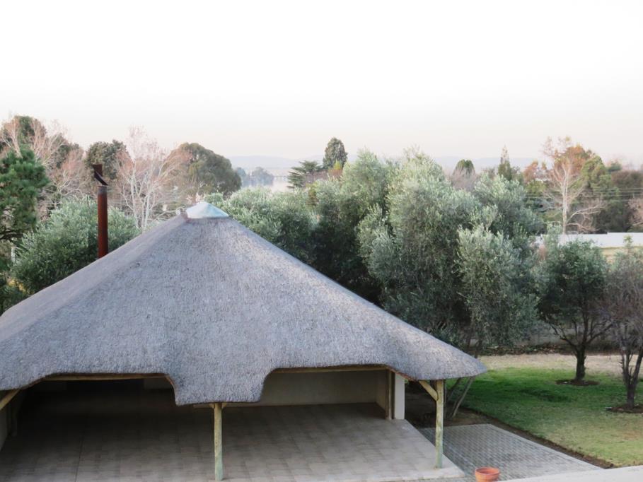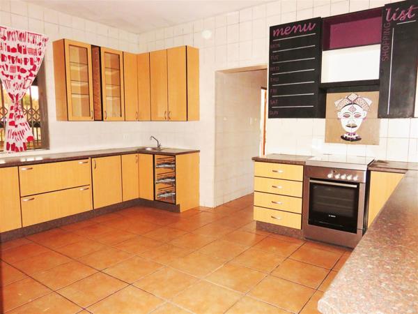 Two master-suites have walk in cupboards & modern bathrooms,1 on each floor.Double-volume dining area boasts a grand staircase leading to TV lounge & other bedrooms upstairs.Extra chalet for guests, too much to mention in this elegant home. Come see for yourself!