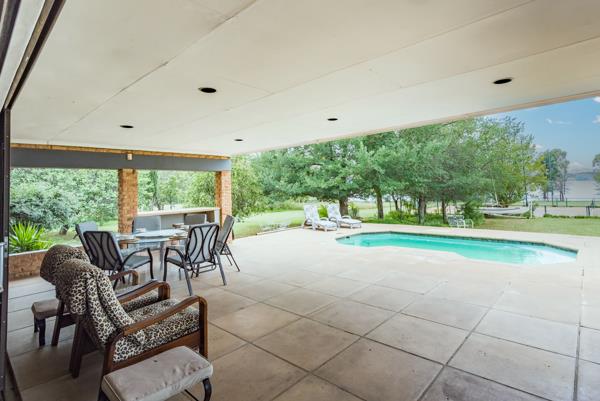 - Open-plan lounge and dining area that flows onto an undercover patio. The patio boasts a built-in braai and overlooks a sparkling swimming pool set amidst a manicured garden with river frontage.
