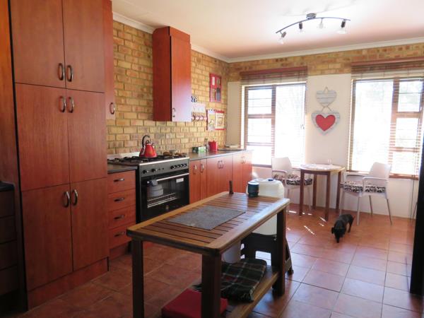 One is greeted by a spacious, double volume open-plan living area complete with an indoor braai & anthracite heater boasting temperature control which pipes warmth into every room. The tiled floors create a warm and inviting atmosphere, while large sliding doors provide an abundance of natural light & picturesque views of the surrounding landscape. A well-appointed kitchen of generous proportions is equipped with a gas stove, making meal preparation a breeze. Each of the three bedrooms is thoughtfully designed with built-in wardrobes to maximise storage and organization. The main suite features an ensuite bathroom including a spar bath, as well as the office & laundry space next door, ensuring your privacy and convenience.