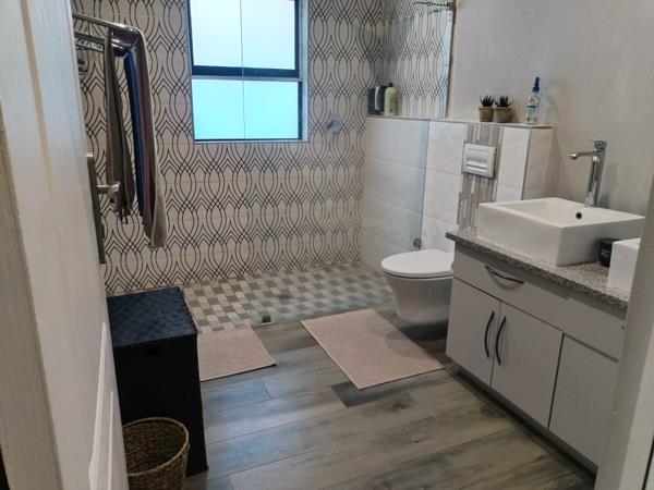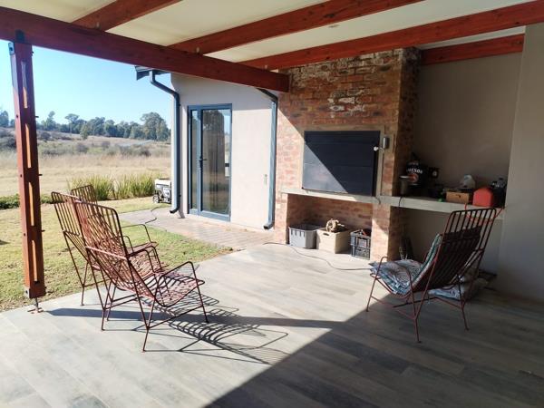 Doors open up on the front porch with an entertainment area with built-in braai and lovely garden.