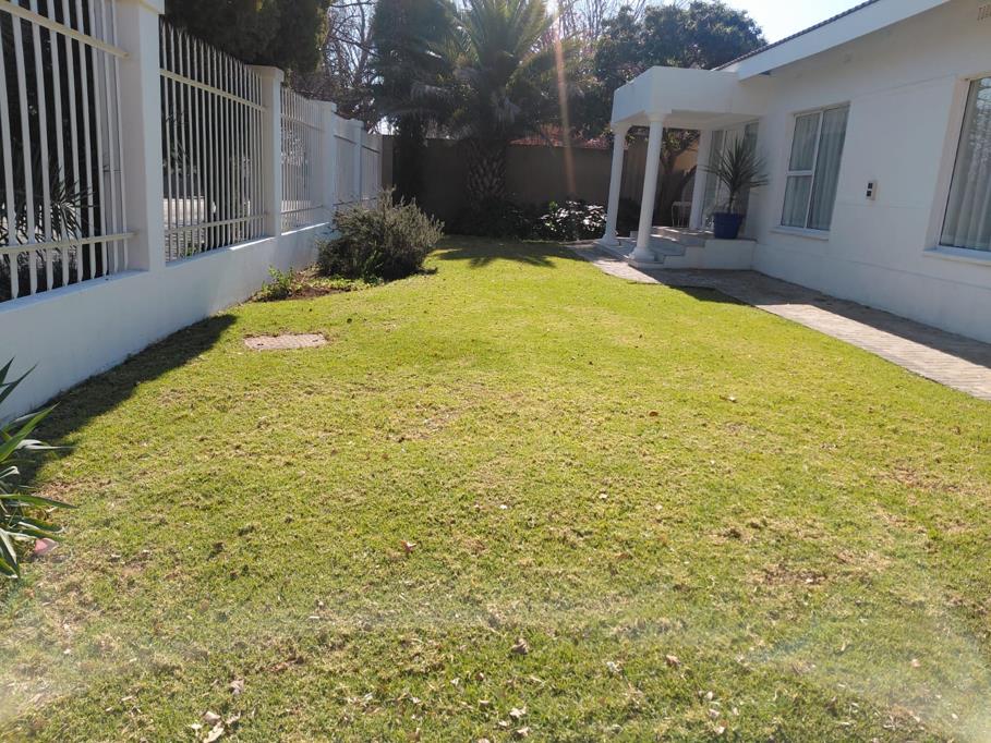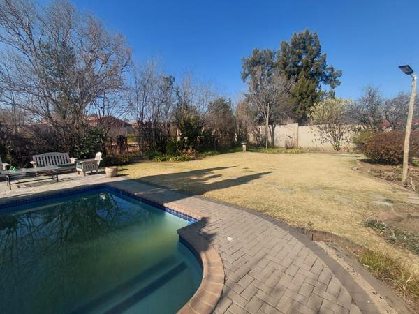 The elegant dining room features a luxurious marble table with stylish chairs (included in the sale), a built-in braai, and a large window overlooking the sparkling swimming pool and lush gardenbringing the outdoors in.