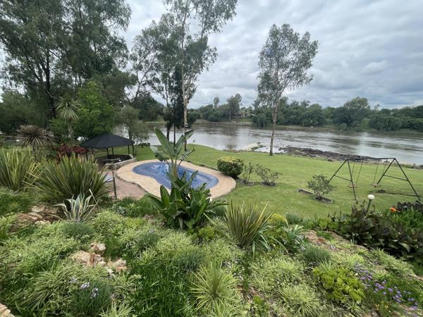 Recreational Spaces: The garden flows into expansive lawns and leads to a developed riverbank with a covered entertainment area, built-in braai, and cement platforms for fishing or water activities. Retaining walls provide added security during river floods.