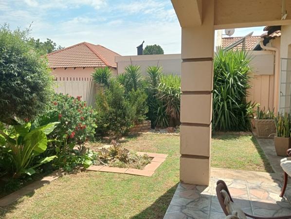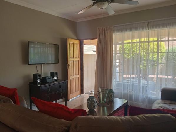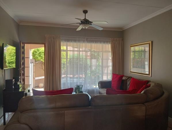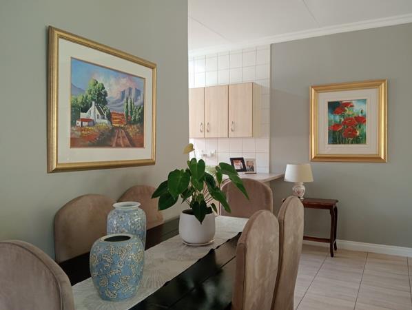 The townhouse offers ample space with well-proportioned bedrooms and enough built-in cupboards. The main bedroom boasts a 12,000 BTU air conditioner and an en suite bathroom with a toilet, basin, and bath. The guest bedroom offers an en suite bathroom with a toilet, basin, and shower. Lovely open plan living - dining area stepping into the half-open plan kitchen with ample cupboards equipped with an 18,000 BTU air conditioner, stove, extractor fan and a scullery. Tiled floors throughout the home with laminated flooring in the bedrooms. Large windows flood the home with natural light making it airy right through the rooms. Single garage fully tiled with an electric motor and a covered carport in front of the garage.