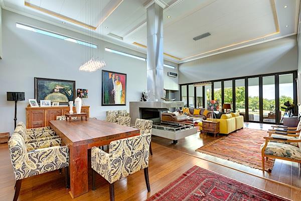 Featuring an expansive double-volume living space offering a custom-designed fireplace centered in the middle of this area, a wine storage wall, dining space, and lounge/TV room. The inside space flows seamlessly through the custom stacker doors onto the spacious patio with built-in braai and swimming pool offering a landscaped garden.