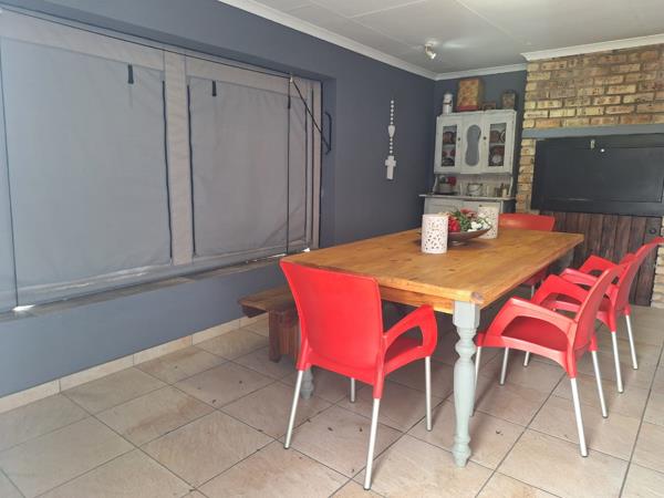 This unit offers an tiled floor entertainment patio with built-in braai and roll-up curtains,