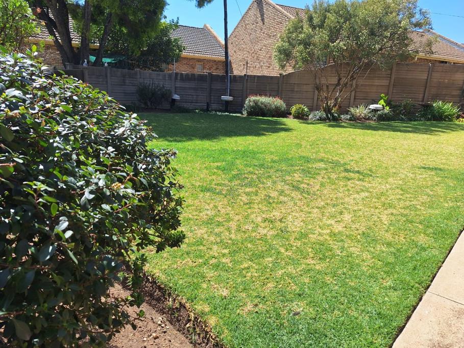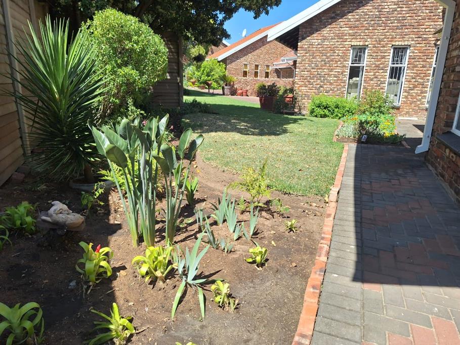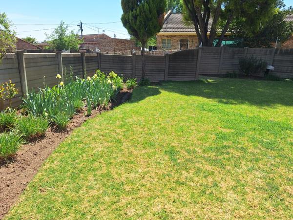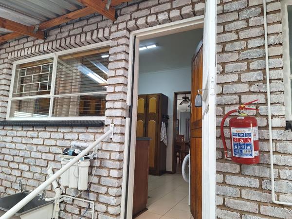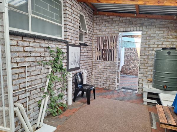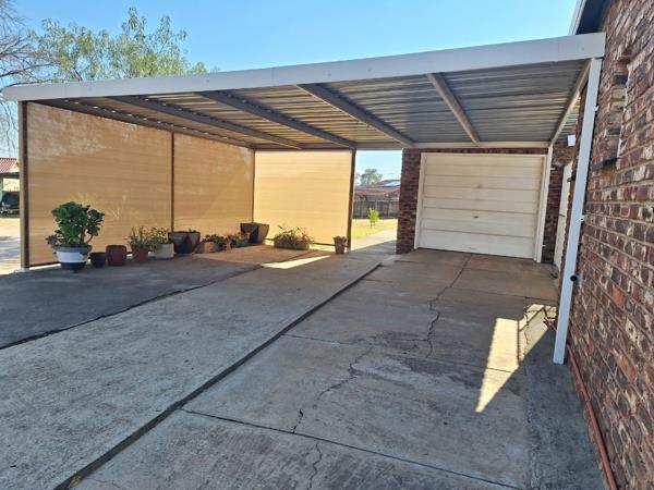 single garage, double carport in front of the garage, enclosed courtyard for washing, roofed area between the garage and outside toilet and kitchen, open plan dining room & lounge with a sliding door into the sunny stoep that is used as the family room, 2 bedrooms with built-in cupboards, full bathroom, guest toilet, spacious garden.