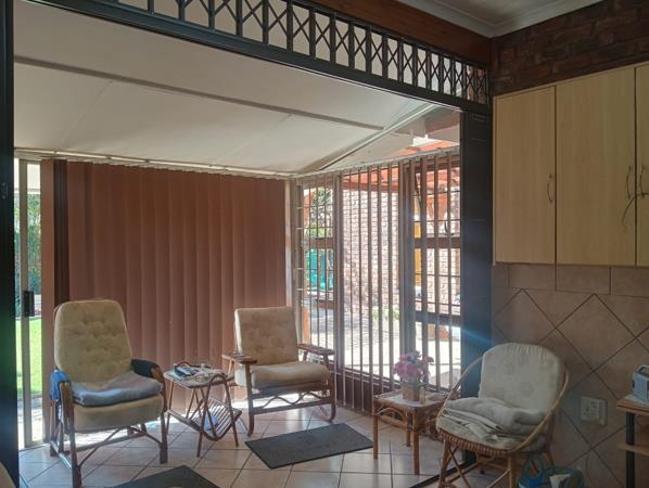 Lovely sun-filled enclosed patio with aluminium windows and door looking out on the beautiful garden.