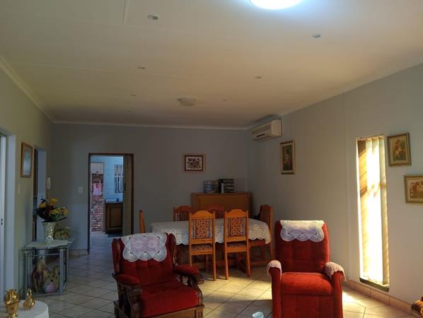 An open-plan lounge and dining area with air conditioning makes life simple with built-in cupboards in the passage.