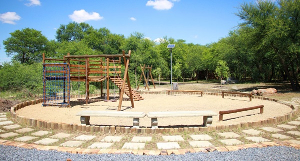 A cozy bonfire area and a childrens play area by the river, perfect for family gatherings.