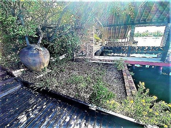 the dining room downstairs, and a closed patio with braai, opening onto the Bushveld garden and pool.