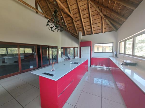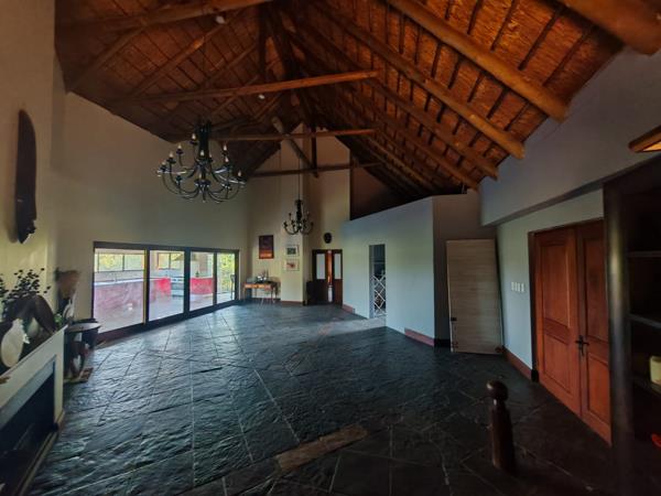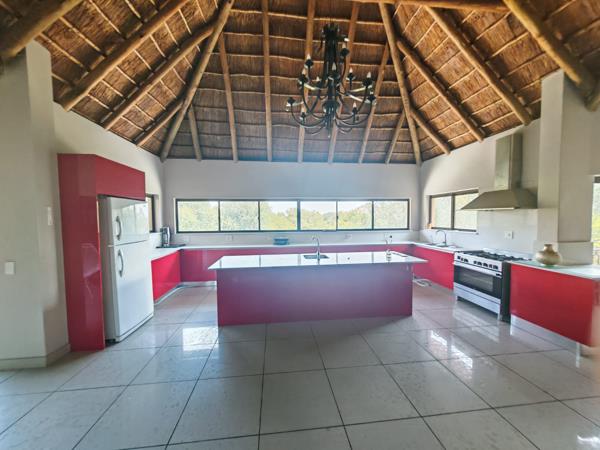 A thatched roof, blending seamlessly into the natural surroundings Spacious lounge, TV room, and entertainment room, each warmed by cozy fireplaces Five lavish bedrooms, each with an elegant en-suite bathroom. Guest toilets for added convenience. Modern kitchen and dining room, perfect for hosting unforgettable gatherings. Expansive patio, complete with a boma and jacuzzi, inviting relaxation and alfresco entertaining. Double lock-up garage and carport, ensuring secure parking. Landscaped garden, featuring beautiful indigenous trees and vibrant flora
