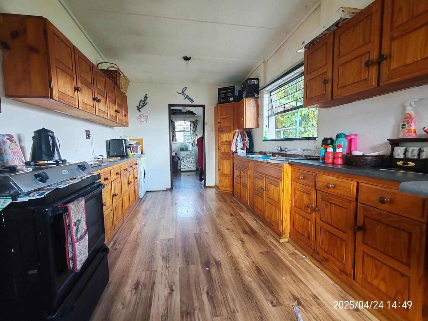 The kitchen is equipped with extensive wooden cabinetry and generous counter space, offering practical storage and preparation areas. While presenting a dated aesthetic, it provides a solid foundation for future modernization. The home includes three well-proportioned bedrooms, with one featuring a unique red carpet, and a full bathroom complete with both a bathtub and a separate walk-in shower. Additional practical amenities include a laundry area, staff quarters, and a dedicated storage space.